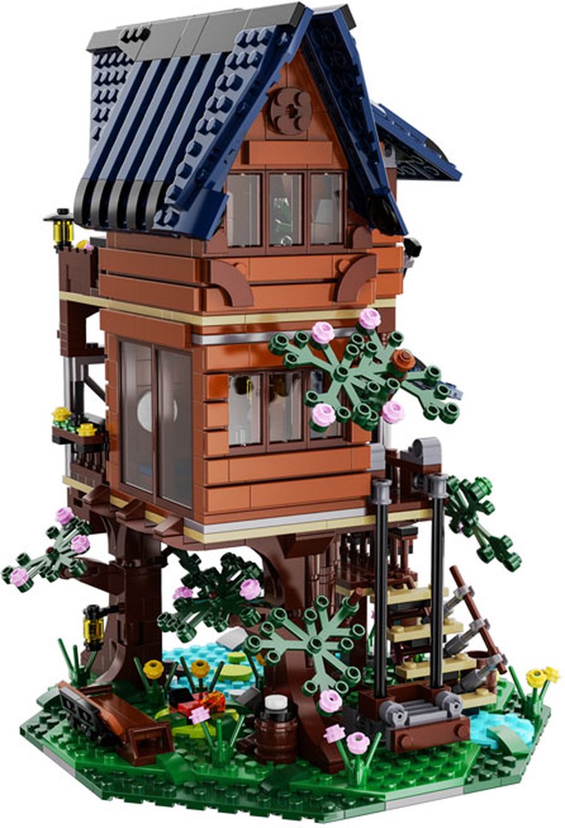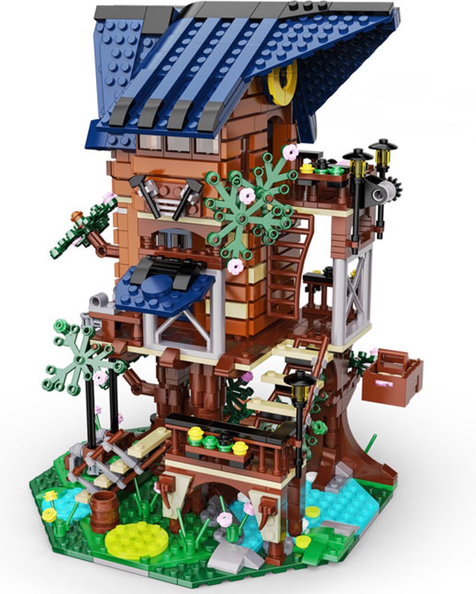 De boomhut is rijk aan charmante details: houten trapjes, een veranda, lantaarns en knusse accessoires zorgen voor een sprookjesachtige uitstraling. Met de LED-verlichting creëer je bovendien een warme, sfeervolle gloed die de boomhut tot leven brengt – perfect als displaymodel op je plank of bureau.