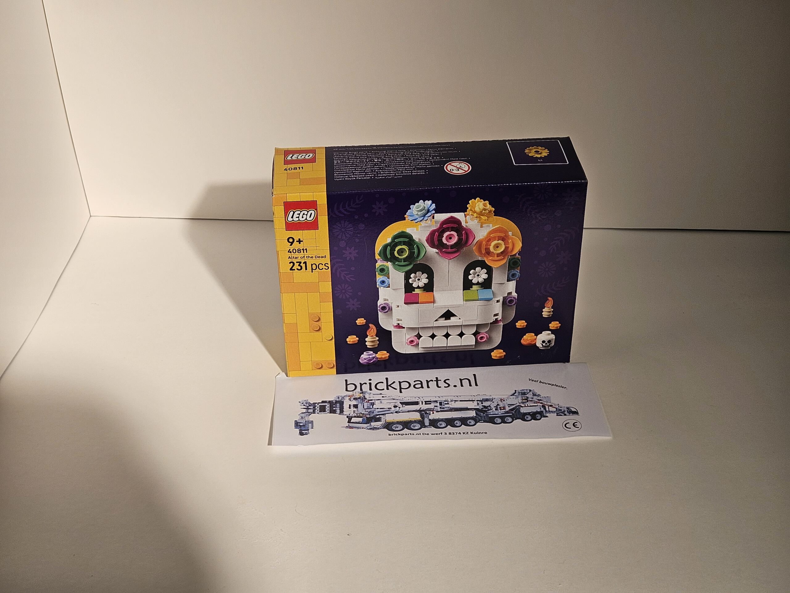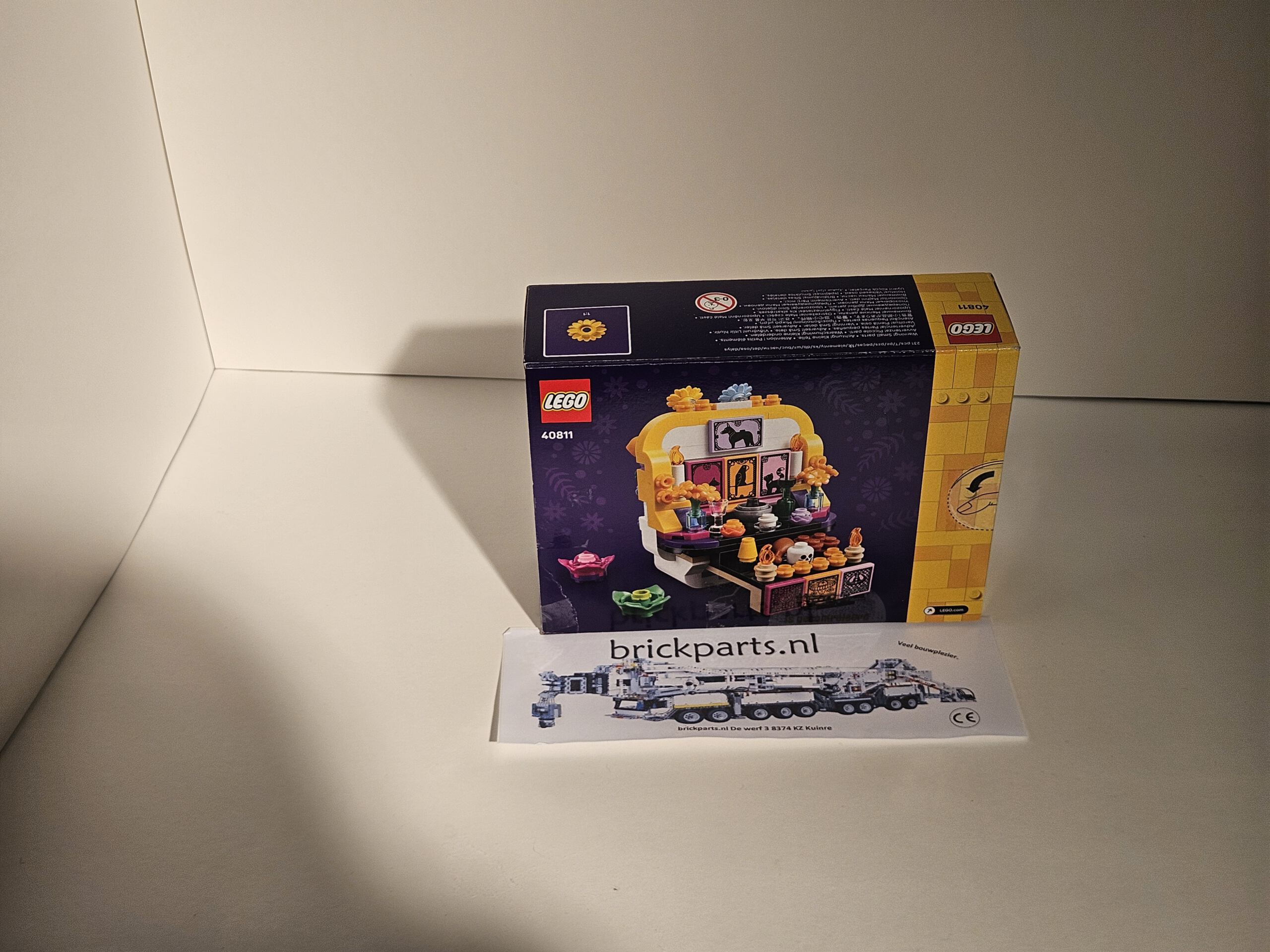 - 2 kanten – de ene kant van het model toont een schedel versierd met LEGO® bloemen, de andere kant een altaar met een bloemenboog en diverse etensaccessoires