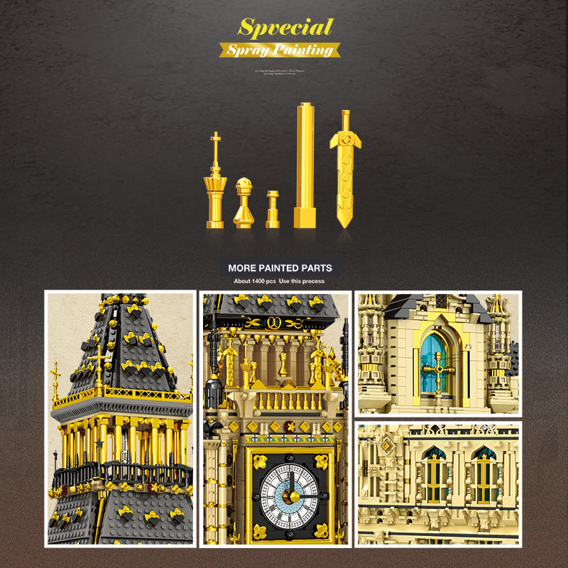 De toren bevat prachtige details zoals de herkenbare gotische structuur, de fijn afgewerkte klokken, realistische ramen en de kenmerkende gouden accenten aan de top. Dankzij het stevige fundament staat het model stabiel en is het ideaal als decoratief displaystuk.